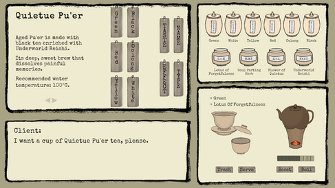 I imagined the full version of this game as an interactive tea-making game that happens in Chinese underworld. Player will roleplay as MengPo, a character in Chinese folk mythology who cooks soup in underworld to eliminate their memories before reincarnation. Game mechanics will be similar to “Va11-Hall-A: Cyberpunk Bartender Action”, focusing on making tea using different ingredients and procedures to guide/change your clients' lives.